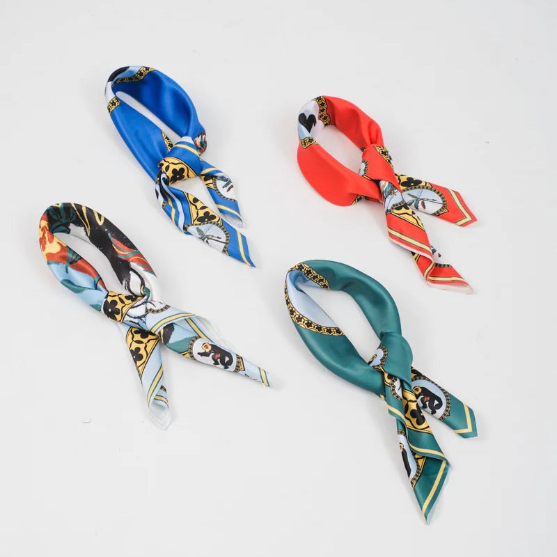 One satin 55x55cm scarf. A versatile piece that can be styled in multiple ways, in assorted and random prints from the Oasea, Soleil and Gilia collections.