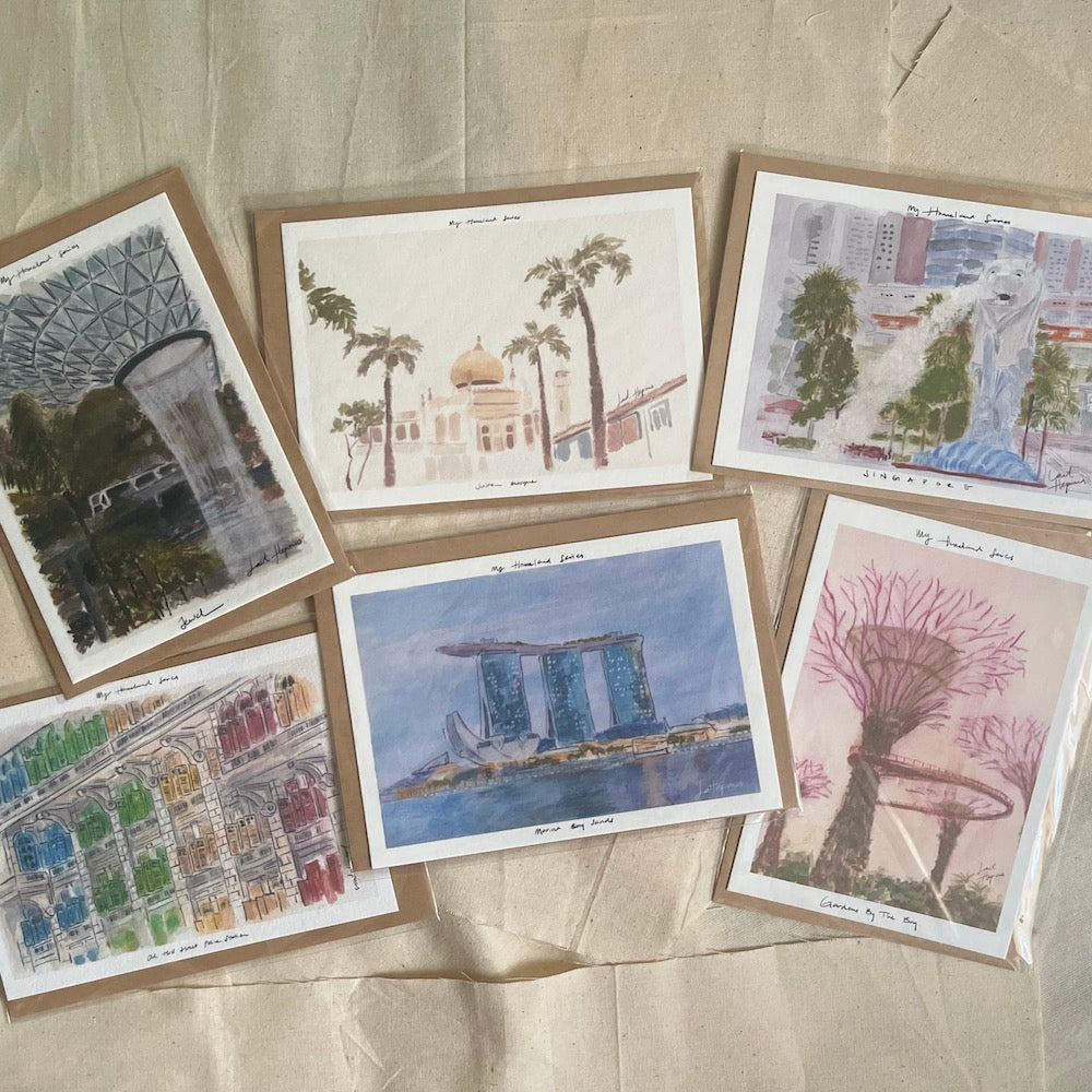 One postcard-sized print varying paintings Singapore's famous landmarks, by artist Aisyah (known as Lait Hepines). Printed on one side and blank at the back.