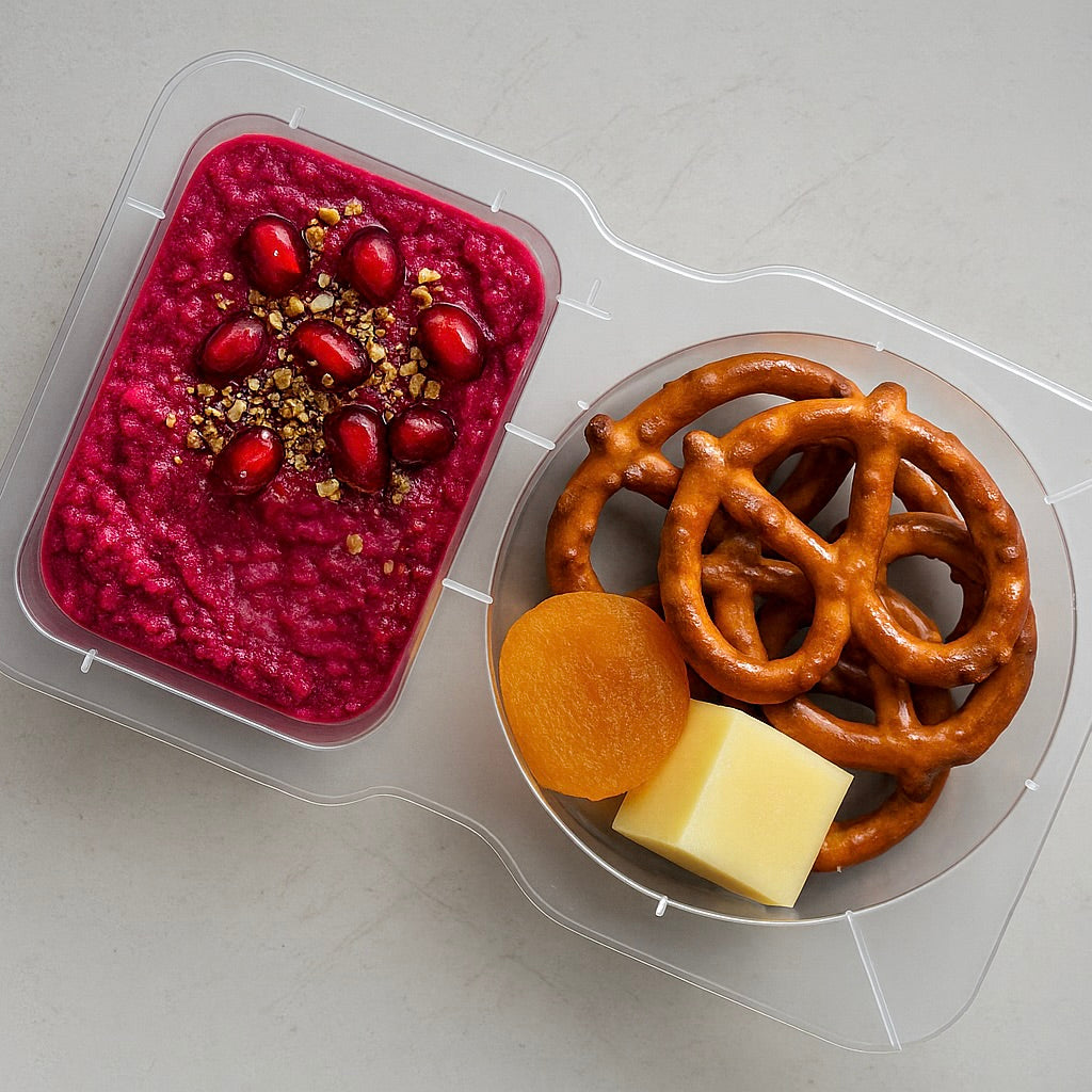 One pre-packed container of handmade dip, pretzels, cheese and dried fruit for grazing and snacking. Contents may vary.