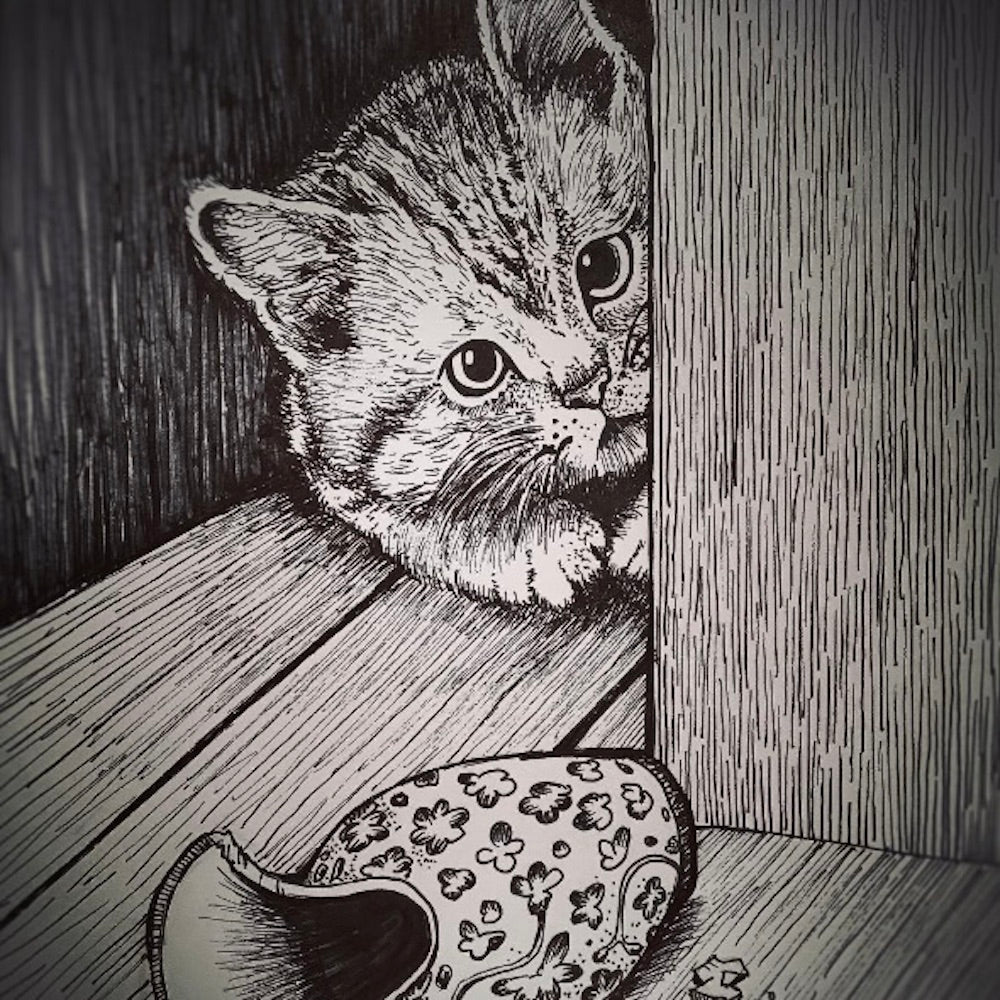 One A5-sized art print with varying ink sketches of cats, by artist Rex Lee.