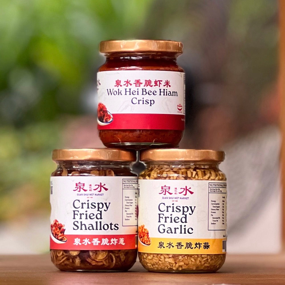 One bottle of Wok Hei Bee Hiam Crisp (180g), our Crispy Fried Garlic (200g) and Crispy Fried Shallots (200g), bottled onsite at random.