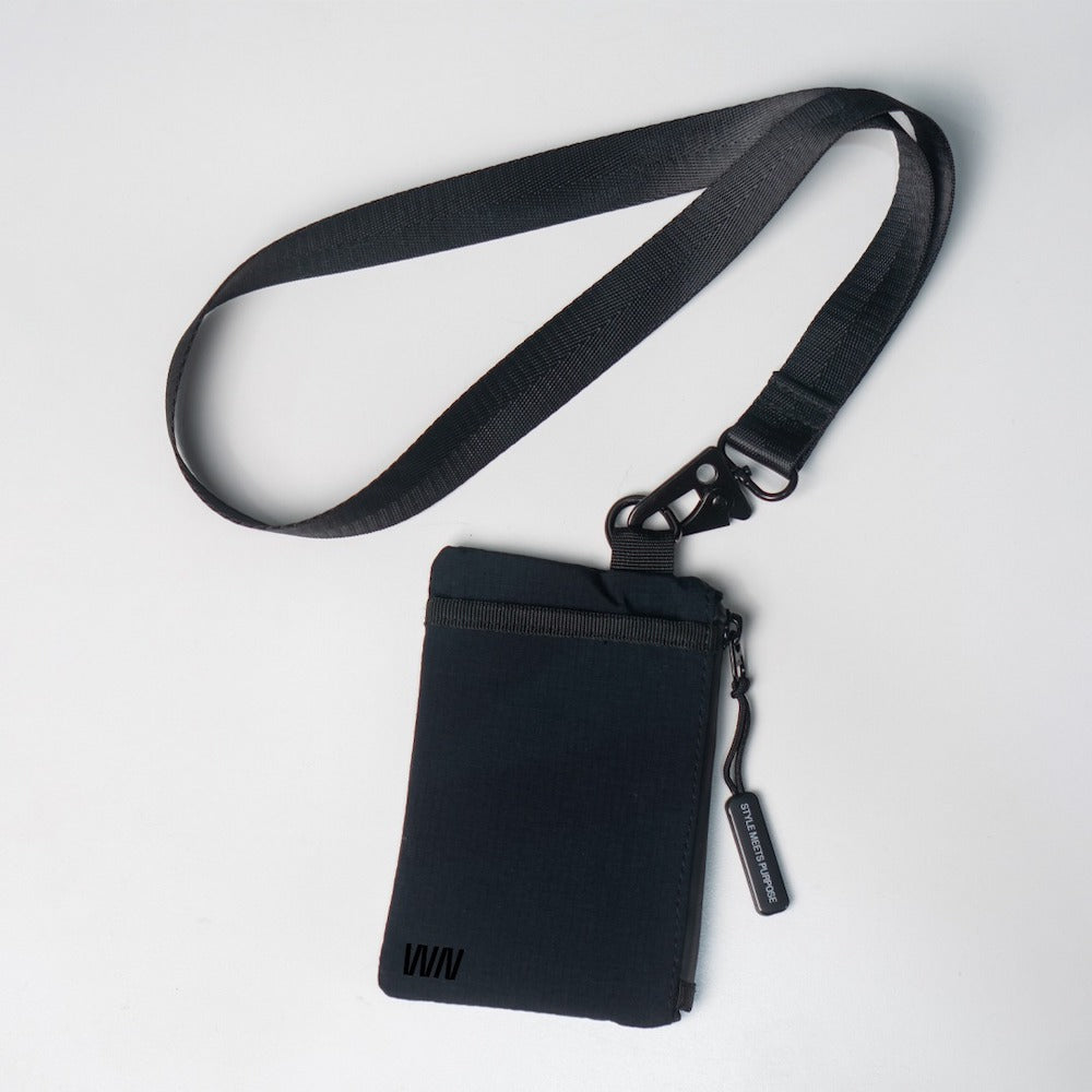 A handy cardholder with a detachable wrist strap, made from sustainable recycled materials.
